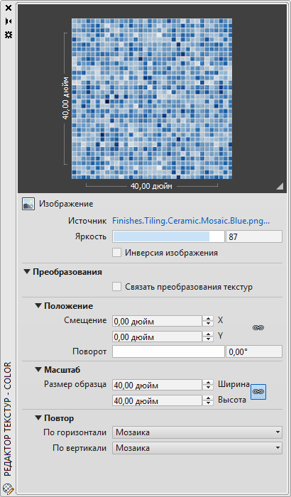 Настройки текстуры управляют множеством свойств текстур, применяемых для материалов, включая положение, масштаб, размер и повторение. Некоторые настройки являются общими для нескольких текстур, другие уникальны для типа текстуры.