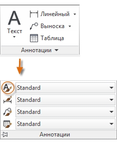 Как и в случае с другими элементами аннотаций, многострочный текст содержит множество параметров. Эти параметры можно сохранить в формате стиля текста с помощью команды СТИЛЬ, а затем к сохраненным стилям текста можно получить доступ, щелкнув стрелку раскрывающегося списка на панели "Аннотации". Текущий стиль текста отображается в верхней части раскрывающегося списка.