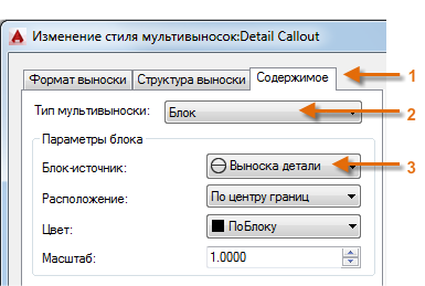 Например, для создания стиля выносного элемента запустите команду МВЫНОСКАСТИЛЬ. В Диспетчере стилей мультивыносок нажмите "Создать" и выберите описательное имя для нового стиля мультивыноски. Щелкните вкладку "Содержимое", выберите "Блок", а затем — "Выноска детали", как показано на рисунке.