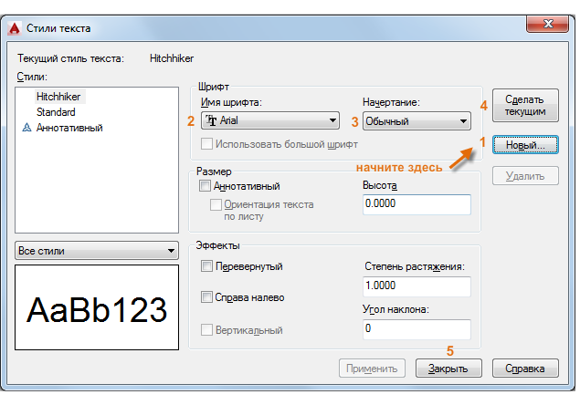 При создании стиля текста необходимо сначала задать его название, а затем выбрать шрифт текста и стиль шрифта. Порядок кнопок для нажатия показан на рисунке ниже: