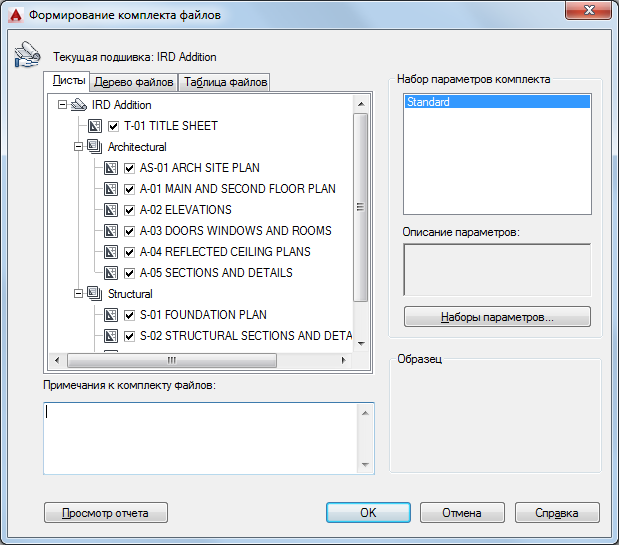Отображение отчетных сведений о комплекте файлов. К их числу относятся заданные примечания к комплекту и автоматически сгенерированные сопроводительные примечания, информирующие о том, как правильно использовать файлы комплекта. Например, если шрифты SHX обнаружены в одном из чертежей комплекта, указывается папка, в которую следует скопировать эти файлы, чтобы их можно было найти в системе, в которой установлен комплект файлов. В отчет также включается текст пользовательских примечаний к комплекту.