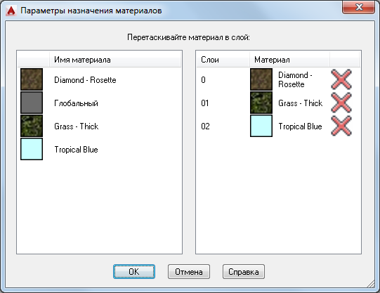 Вывод списка всех слоев в чертеже и во всех внешних ссылках, назначенных чертежу. Миниатюра материала показывает, какой материал был назначен слою. Для открепления материала от слоя нажмите кнопку "Отключить" (значок X).