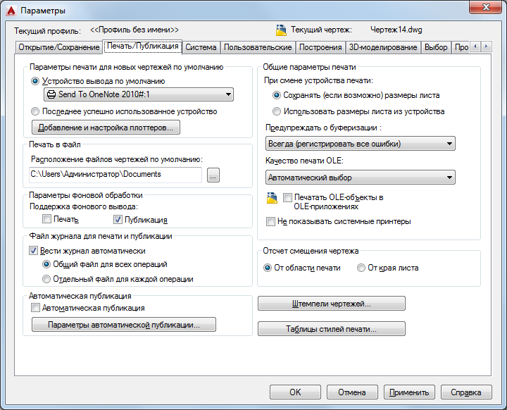 Задание принимаемого по умолчанию устройства вывода для новых чертежей и для чертежей, созданных в версии 14 AutoCAD или в более ранних версиях и не сохранявшихся ни в AutoCAD 2000, ни в более поздних форматах.