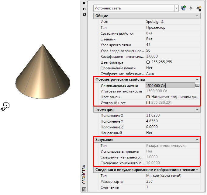 Ниже показан пример фотометрического прожектора и палитры свойств освещения; фотометрические свойства выделены рамкой.