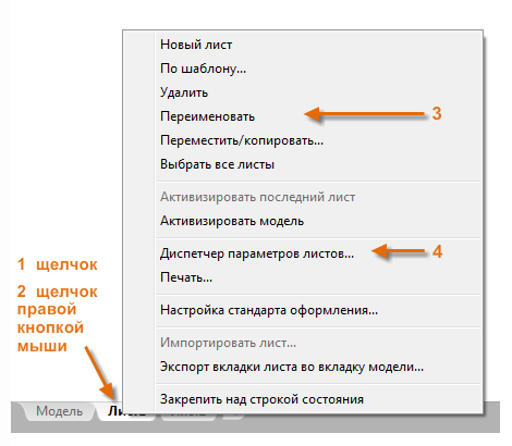При открытии вкладки листа (1) в первую очередь нужно щелкнуть по ней правой кнопкой мыши (2) и изменить ее имя (3) на что-то более конкретное, чем "Лист 1". Для листов формата D подойдут названия вроде ARCH D или ANSI D.