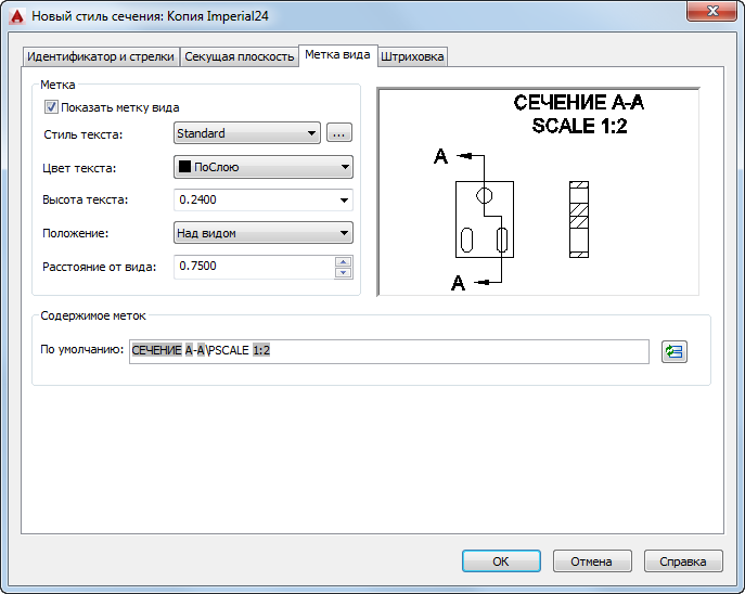 Задание свойств для стиля текста, размещения и образца метки сечения.