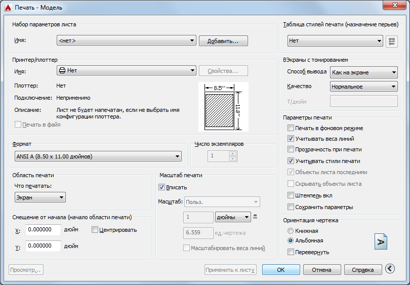 Для удобства можно сохранить и восстановить наборы этих параметров по имени. Они называются наборами параметров листа. Наборы параметров листа позволяют сохранять параметры, необходимые для различных принтеров, печати в оттенках серого, создания файла PDF из чертежа и т. д.