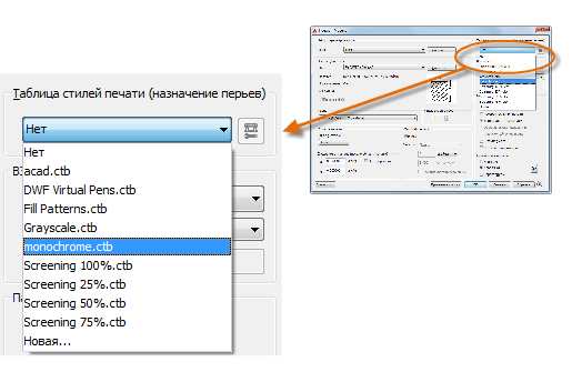 В таблице стилей печати содержится информация об обработке цветов. Цвета, которые хорошо смотрятся на экране монитора, могут не подходить для файла PDF или для печати. Например, может потребоваться создать цветной чертеж с монохромным выводом. Вот так можно задать монохромный вывод:
