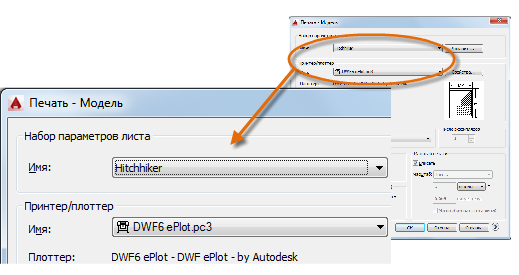 При выводе на печать можно просто указать имя набора параметров листа в диалоговом окне "Печать", и все параметры печати будут восстановлены. На следующем рисунке в диалоговом окне "Печать" установлен набор параметров листа "Hitchhiker", который создает выходной файл DWF (Design Web Format), а не выводит чертеж на плоттер.