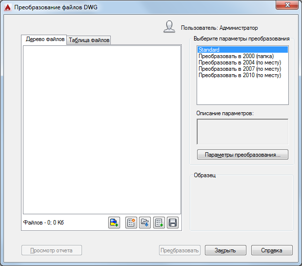 Открывает стандартное диалоговое окно выбора файлов, в котором можно выбрать файлы чертежей, добавляемых в список для преобразования. Эта кнопка находится как на вкладке "Дерево файлов", так и на вкладке "Таблица файлов".