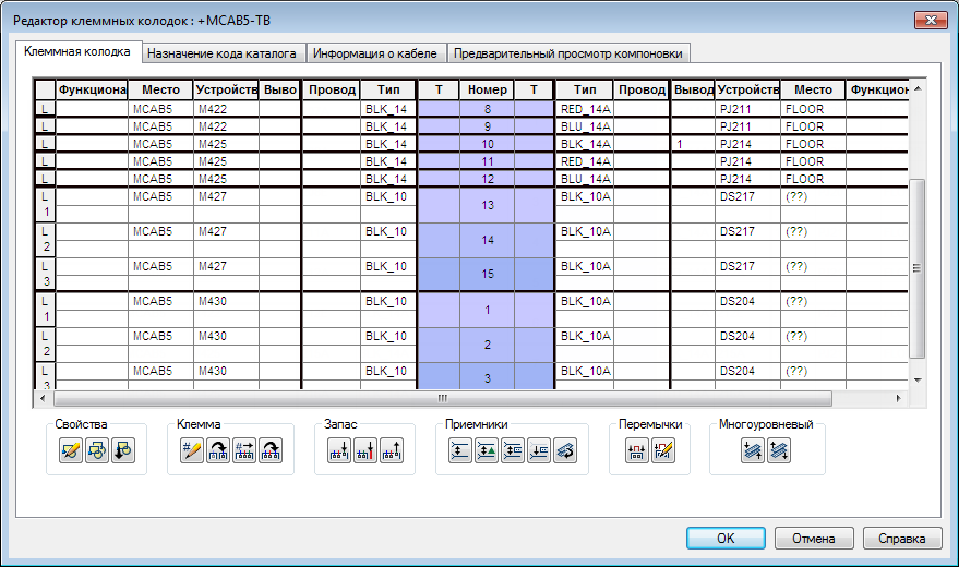 Для управления клеммами, редактирования свойств клемм, соединения клемм и вставки графической клеммной колодки служит редактор клеммных колодок.