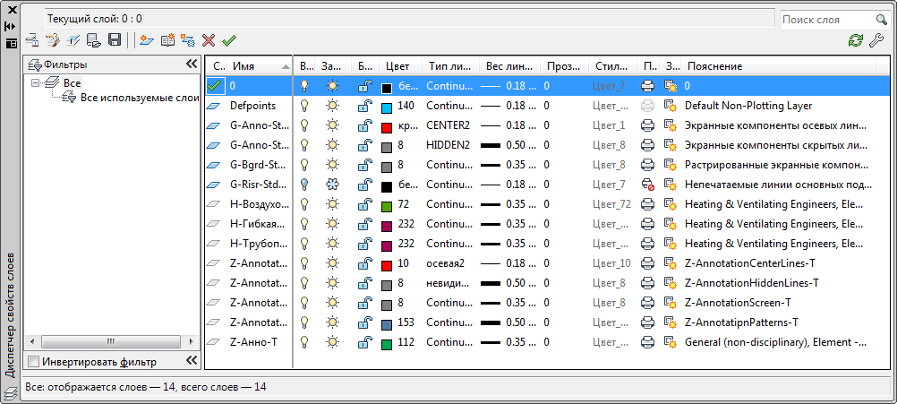 Диспетчер свойств слоев позволяет осуществлять просмотр и управление слоями в текущем чертеже.