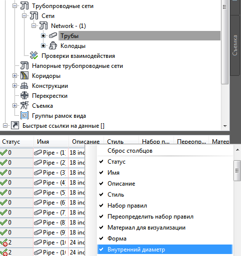 На вкладке "Навигатор" трубопроводной сети можно быстро изменить стили нескольких труб или колодцев, как отображено на рисунке 3.