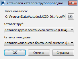 В AutoCAD Civil 3D используемые по умолчанию каталоги элементов трубопроводных сетей устанавливаются в папке C:\Documents and Settings\All Users\Application Data\Autodesk\AutoCAD Civil 3D <версия>\rus\Pipes Catalog. Для чертежа можно задать другой каталог, выбрав инструмент вкладки "Главная"