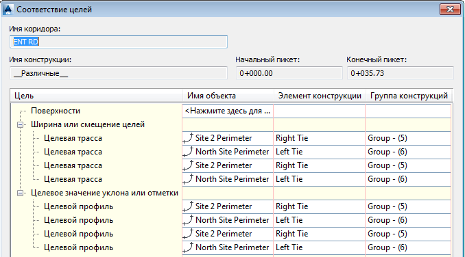 В диалоговом окне "Свойства коридора" можно назначить цели для фигур съемки и полилиний, а также для трасс и профилей. Чтобы обратиться к свойствам коридора, выберите коридор, щелкните правой кнопкой мыши и выберите пункт "Свойства коридора". Диалоговое окно "Свойства коридора" показано на рисунке 32.
