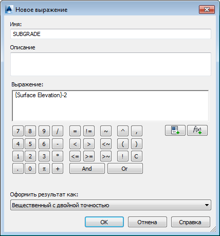 С помощью стилей меток можно создавать и именовать математические выражения на основе характеристик маркируемых объектов. Например, можно создать выражение, в котором отметки в точках поверхности определяются как разность действительных значений отметок поверхности и заданного значения. Такое выражение может иметь название "ОСНОВАНИЕ" и выглядеть следующим образом: {отметка поверхности}-2, где "Отметка поверхности" - это характеристика, или именованное свойство, данной поверхности.