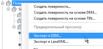 AutoCAD Civil 3D позволяет экспортировать файлы DEM из поверхности. В момент экспорта можно увеличить шаг сетки, чтобы уменьшить размер файла. На рис. 3 изображено меню, используемое для запуска процесса экспорта.