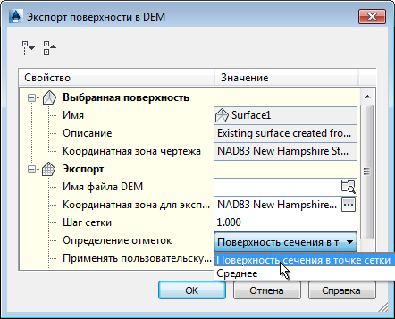 Важным параметром экспорта является метод определения отметки в каждой точке. Можно либо создавать выборку отметок поверхности в точке сетки, либо вычислять среднюю отметку по соседним точкам. Второй метод (усреднение) требует больших затрат времени. Для повышения эффективности следует использовать опцию выборки поверхности, как показано на рис. 4.