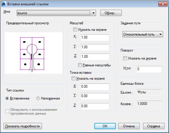 - В диалоговом окне "Внешняя ссылка" задайте для параметра "Точка вставка" значение "0,0,0", для параметра "Масштаб" - "1,1,1" и для параметра "Угол поворота" - "0".