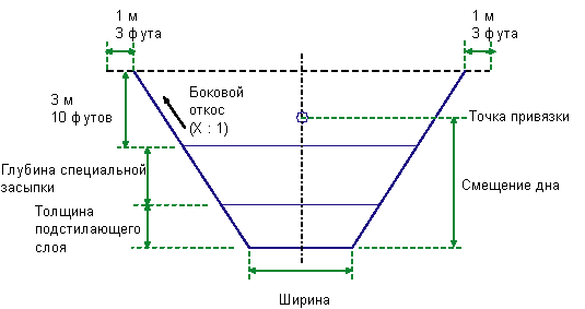 Точка привязки расположена на расстоянии "Смещение дна" над серединой основания канавы.