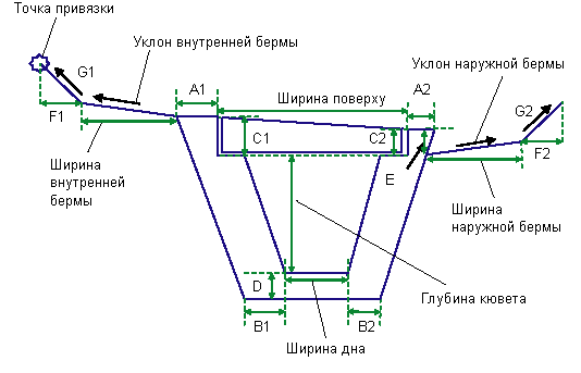 Точка привязки является крайней внутренней точкой на звеньях профилирования, предшествующих конструкции кювета. Если звенья профилирования пропускаются, то точка привязки является крайней внутренней точкой на внутренней стене.