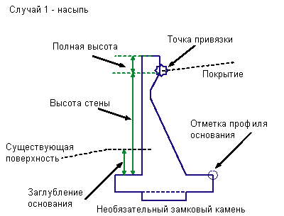 Точка привязки меняется в зависимости от нахождения подпорной стены в состоянии выемки или насыпи. Если это насыпь, точка привязки находится вблизи верхнего края подпорной стены. Если это выемка, точка привязки находится вблизи основания.