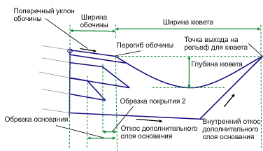 | Обрезка слоя основания | Уменьшенная ширина материала слоя основания для обеспечения возможности вставки дополнительного слоя основания. Боковая кромка слоя материала будет иметь такое же значение откоса, что и выход на рельеф обочины. | Числовое, положительное |