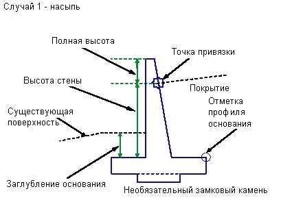 | Заглубление основания | Величина заглубления, измеряемая от верха основания до линии проектной поверхности на тыльной стороне стены в случае насыпи или до привязки в случае выемки. | Числовое |