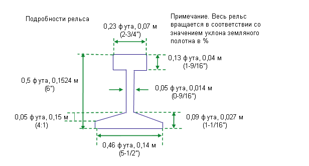 Точка привязки находится на расстоянии, равном высоте рельсов относительно осевой линии шпал.