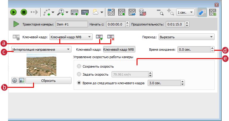 - Сохранить скорость — сглаживание переходов между снимками при существенном варьировании расстояний. Перемещение камеры между снимками, географически близкими друг к другу, осуществляется ровнее по сравнению со снимками, отдаленными друг от друга. Параметр Сохранить скорость можно задать для всех снимков последовательности кроме первого.