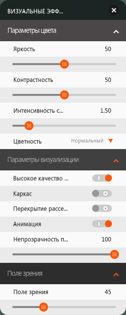 Панель визуальных эффектов | Экспериментируйте с этими параметрами, чтобы увидеть, как их применение влияет на отображение модели. |