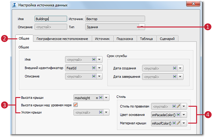 - Задайте дополнительные свойства стиля для данного типа данных, такие как, например, базовый цвет фасада здания или материал крыши.