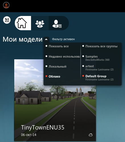 Прим.: Выполните вход в InfraWorks 360, используя учетную запись Autodesk 360. Для просмотра и загрузки облачных моделей, а также для фильтрации моделей по группе, необходимо выполнить вход в InfraWorks 360.