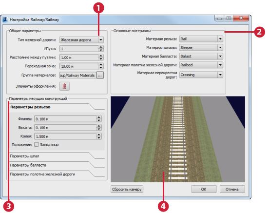 Укажите значения закраины, высоты рельса и колеи. Указывает, находятся ли рельсы непосредственно на поверхности земли (без шпал) или нет. Закраина должна быть меньше, чем половина высоты шпалы, а колея должна быть меньше длины шпалы. |