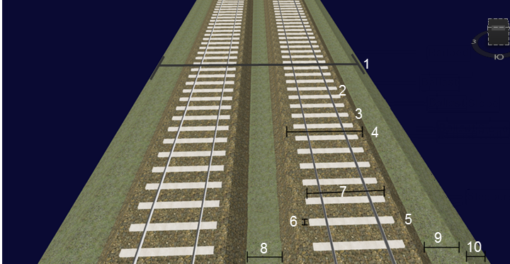 Укажите значения площади полотна (поверхности, на которой находится железная дорога). Укажите значения дренажа, подъема и прогона полотна. Дренаж — это часть полотна, которая находится вне области балласта. Если он достаточно широк, рабочие могут отходить на него во время прохода поездов. Прогон не может быть больше 70 градусов. |