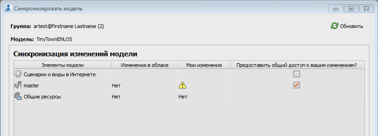 Для включения сценария в синхронизацию необходимо установить флажок "Предоставить общий доступ к вашим изменениям?" рядом со сценарием или видом в Интернете на панели "Синхронизировать модель". См. также Синхронизация моделей.