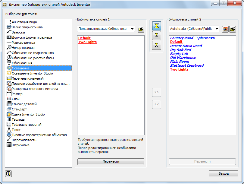 - В примере, приведенном на предыдущем рисунке, стиль освещения выбран в области "Выберите тип стиля" (список в левой части диалогового окна). Кроме того, пути папок старой и новой библиотеки стилей выбраны с помощью соответствующей кнопки обозревателя. Их содержимое отображается на левой и правой панелях соответственно, и на панели старой библиотеки стилей выделена кнопка "Перенести".