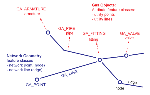 Gas objects are stored in the GA_POINT.FID_ATTR (utility points) and GA_LINE.FID_ATTR (utility lines) attribute feature classes. These have a relation to the associated point or line geometry feature class. |