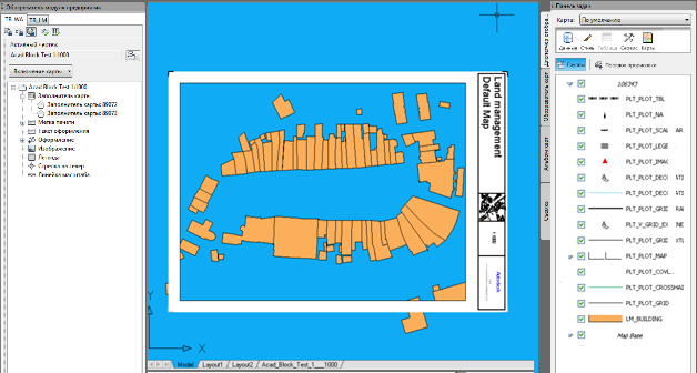- Импортировать демонстрационный дамп землеустройства и присвоить отраслевой модели имя PLOT_ACADBLOCKS. Для этой модели необходимо также включить расширение "Печать".