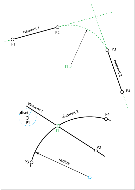С помощью функции пересечения можно рассчитать пересечение двух элементов (прямых линий или дуг окружности) или подключить два элемента по касательной или окружности (касательная).