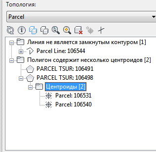 В диалоговом окне "Проверка пространственной топологии" перечислены все обнаруженные ошибки топологии в обозревателе элементов.
