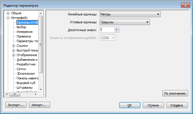 2. Разверните узел "Интерфейс" в диалоговом окне "Редактор параметров" и выберите пункт "Единицы отображения".