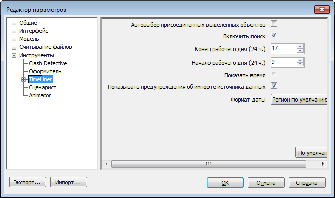- Разверните узел Инструменты в редакторе параметров и щелкните на пункте Шкала времени.
