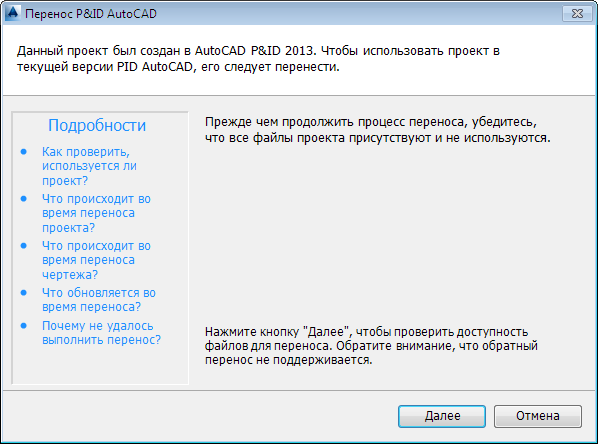 Обеспечивает проверку допустимости проекта к переносу из предыдущей версии AutoCAD P&ID в AutoCAD P&ID 2015.