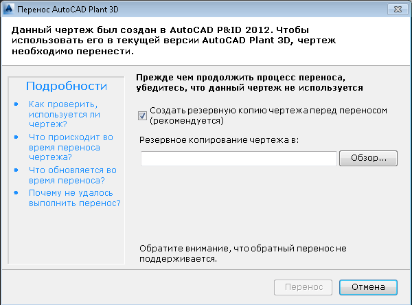 Рекомендуется создать резервную копию чертежа на тот случай, если его потребуется дорабатывать в AutoCAD P&ID 2011.