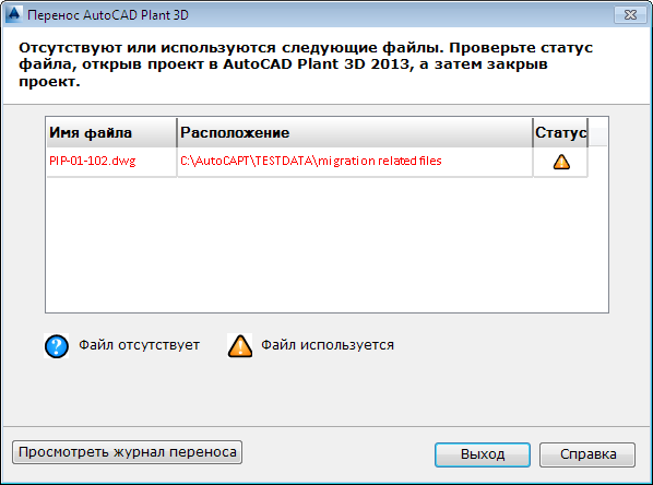 Для успешного переноса проекта программе AutoCAD P&ID требуется возможность эксклюзивной блокировки всех связанных с проектом файлов. Страница "Файл недоступен" отображается, если связанный с проектом файл отсутствует, или если он в настоящий момент используется. Предположим, был перемещен чертеж, или файл был удален из папки проекта, или же кто-либо редактирует чертеж с помощью AutoCAD P&ID 2009.