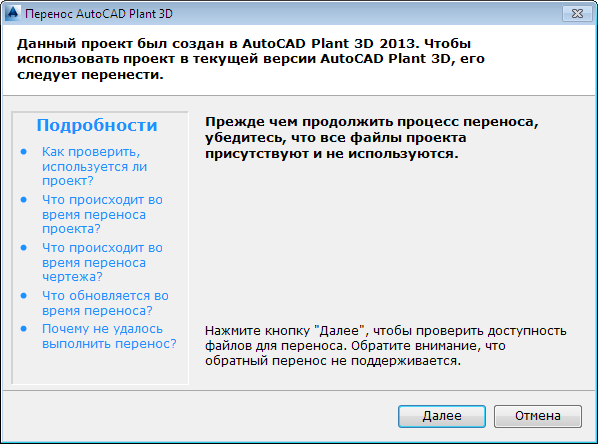 - Убедитесь, что проект и связанные с ним файлы чертежей закрыты. На странице "Запуск переноса проекта" нажмите кнопку "Далее".