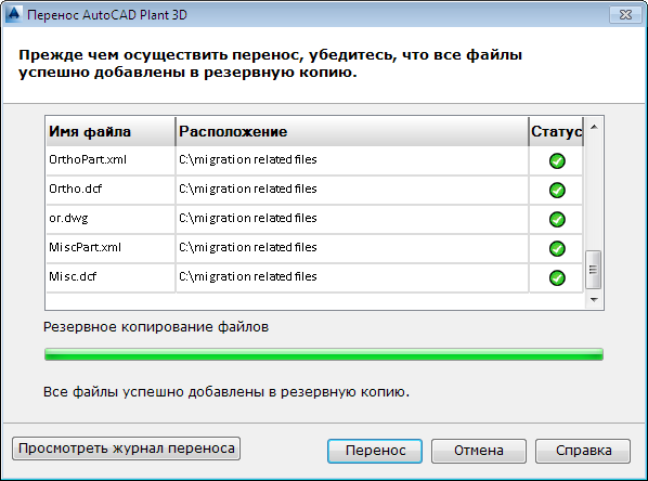 - Нажмите кнопку "Далее". На странице "Резервное копирование при переносе проекта" отображается ход выполнения резервного копирования, а также сообщается об успешном создании резервной копии каждого из файлов.