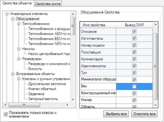 - В структуре выберите компонент (например, Оборудование). На панели "Свойства" в столбце "Вывод DWF" следует снять флажки свойств, которые не нужно публиковать (например, Масса).