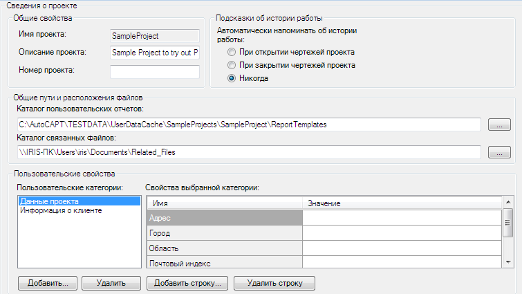 В прочие общие проектные сведения входят пути, журнал истории работы, параметры запросов, настройки зумирования Диспетчера данных и связь группы инструментальных палитр.